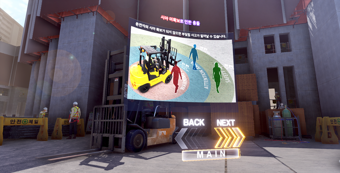 1. Content : Forklift Collision VR 2. Type : Industrial safety 3. Play time : 3 min 4. Operation: Streamlined(PC), Wireless(Mobile) 5. Devices : Vive pro2, Meta Quest3, Meta Quest3S, Pico 4, Pico 4 Ultra 6. Minimum space : 2m x 2m 7. Supported Language : Korean, English, Chinese, Vietnamese, Hindi |