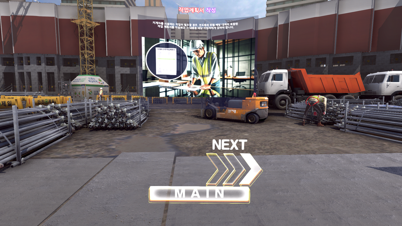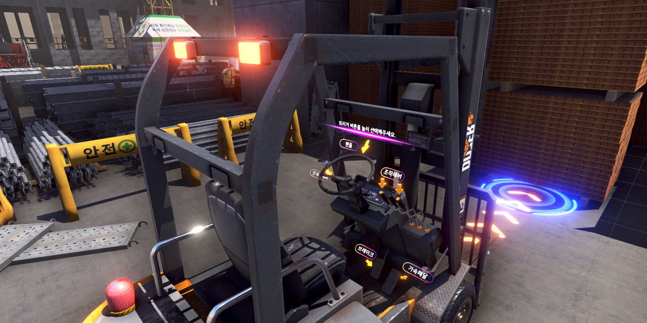 1. Content : Forklift Overturn VR 2. Type : Industrial safety 3. Play time : 3 min 4. Operation: Streamlined(PC), Wireless(Mobile) 5. Devices : Vive pro2, Meta Quest3, Meta Quest3S, Pico 4, Pico 4 Ultra 6. Minimum space : 2m x 2m 7. Supported Language : Korean, English, Chinese, Vietnamese, Hindi |