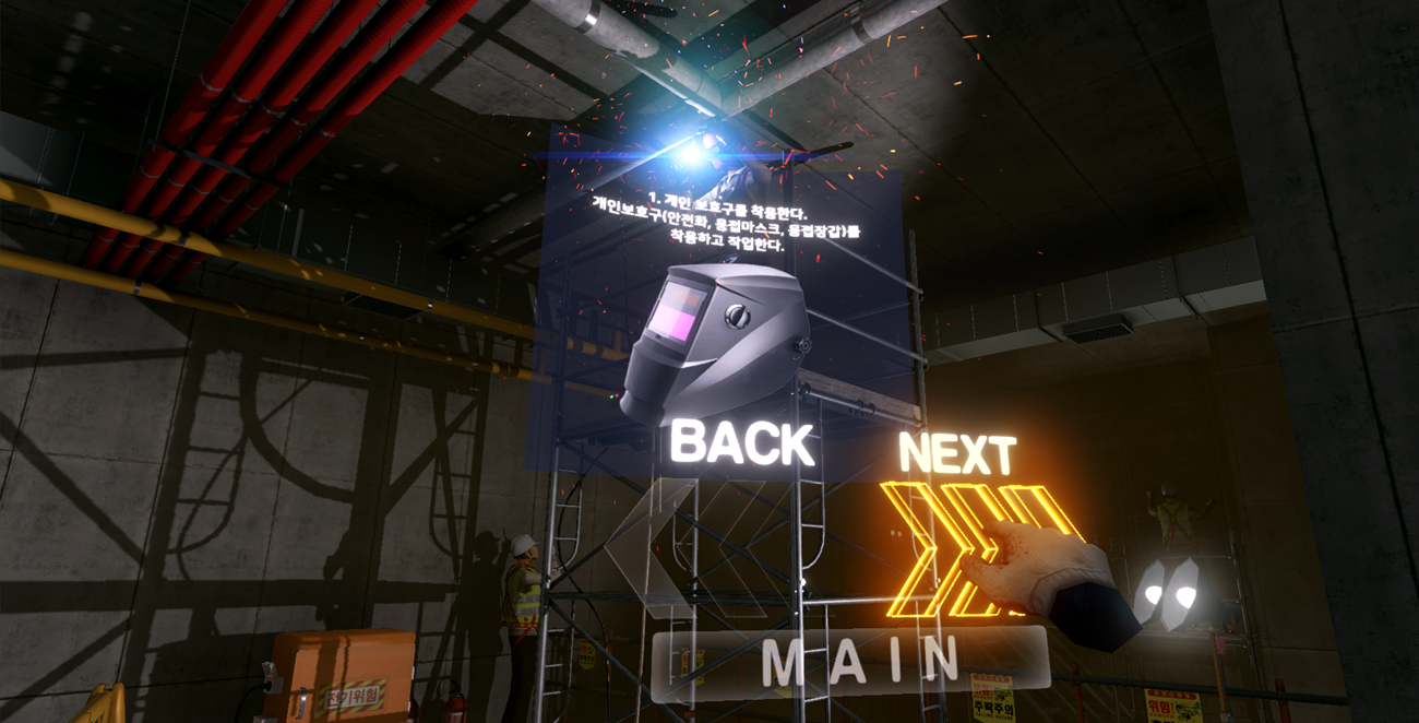 1. Content : Welding Fire VR 2. Type : Industrial safety 3. Play time : 3 min 4. Operation: Streamlined(PC), Wireless(Mobile) 5. Devices : Vive pro2, Meta Quest3, Meta Quest3S, Pico 4, Pico 4 Ultra 6. Minimum space : 2m x 2m 7. Supported Language : Korean, English, Chinese, Vietnamese, Hindi |